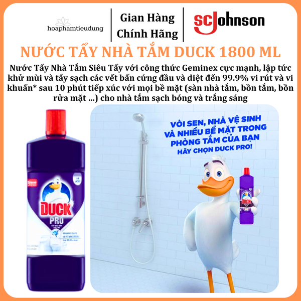 - Duck Nước Tẩy Nhà Tắm Siêu Tẩy với công thức Geminex cực mạnh, lập tức khử mùi và tẩy sạch các vết bẩn cứng đầu và diệt đến 99.9% vi rút và vi khuẩn* sau 10 phút tiếp xúc với mọi bề mặt (sàn nhà tắm, bồn tắm, bồn rửa mặt …) cho nhà tắm sạch bóng và trắng sáng.